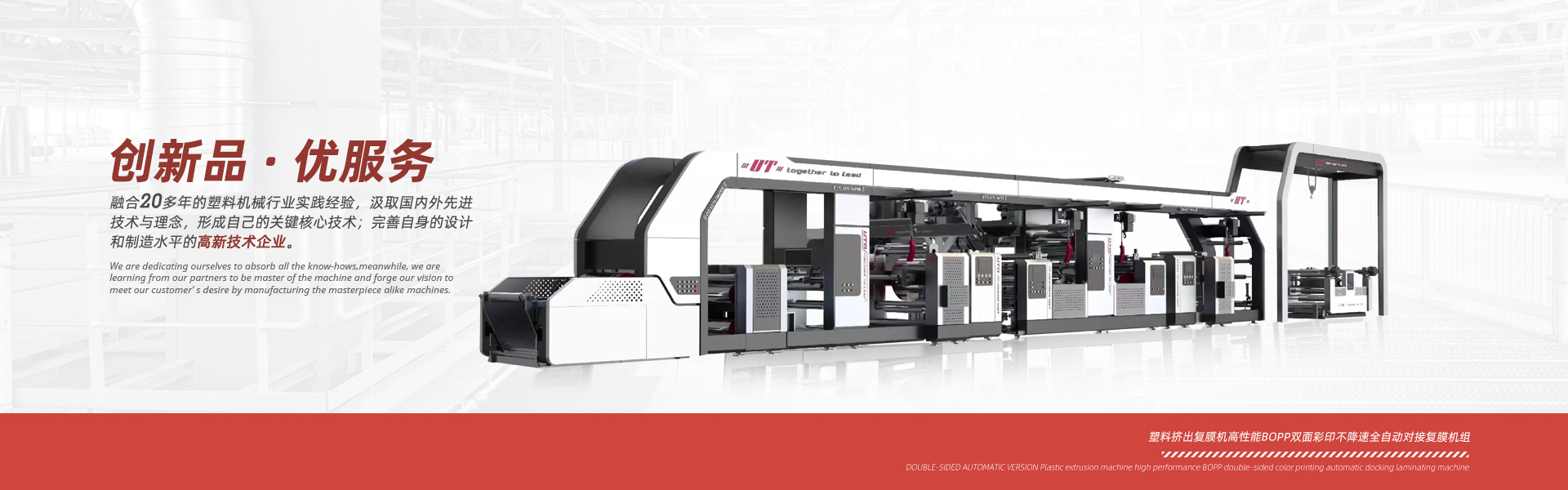 優(yōu)特機械精心致力于塑料編織行業(yè)、紙塑軟包裝行業(yè)、輪胎制造行業(yè)等成套生產(chǎn)設(shè)備的設(shè)計和制造,并為用戶提供生產(chǎn)工藝及培訓(xùn)。我們的服務(wù)范圍包括各類塑料覆膜機、紙張覆膜機、BOPP彩印膜雙面自動對版覆膜機、 紙塑邊縫三合一覆膜機、中縫印刷制袋機、以及輪胎行業(yè)循環(huán)回收使用的隔離膜生產(chǎn)線。